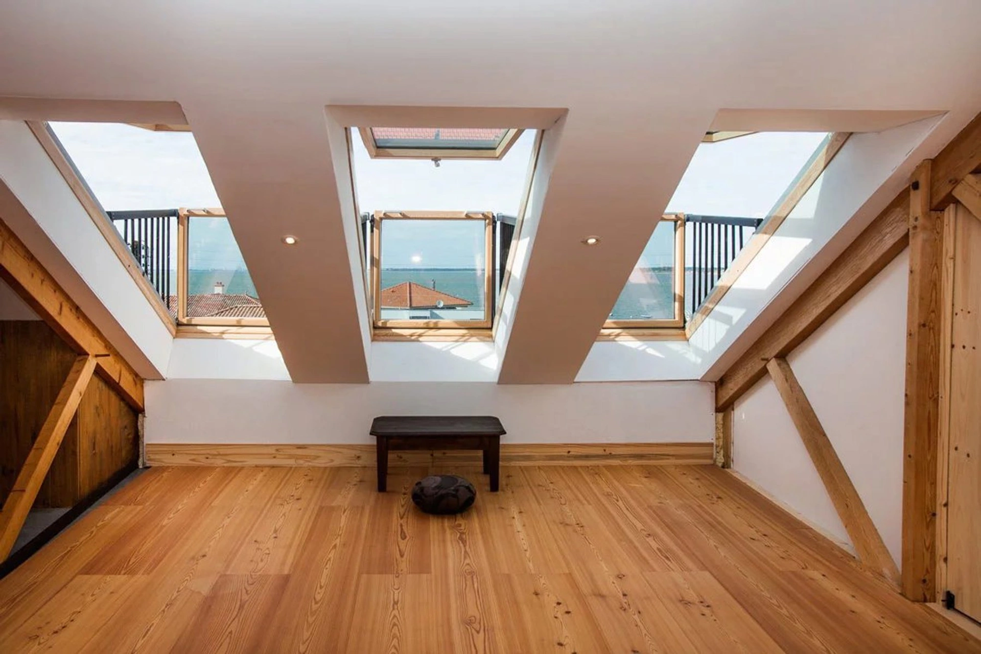• Au 2ème, belle chambre ou dortoir avec charpente apparente et 3 velux-balcons offrant une vue mer imprenable. Des greniers pour plus de rangements complètent ce niveau.