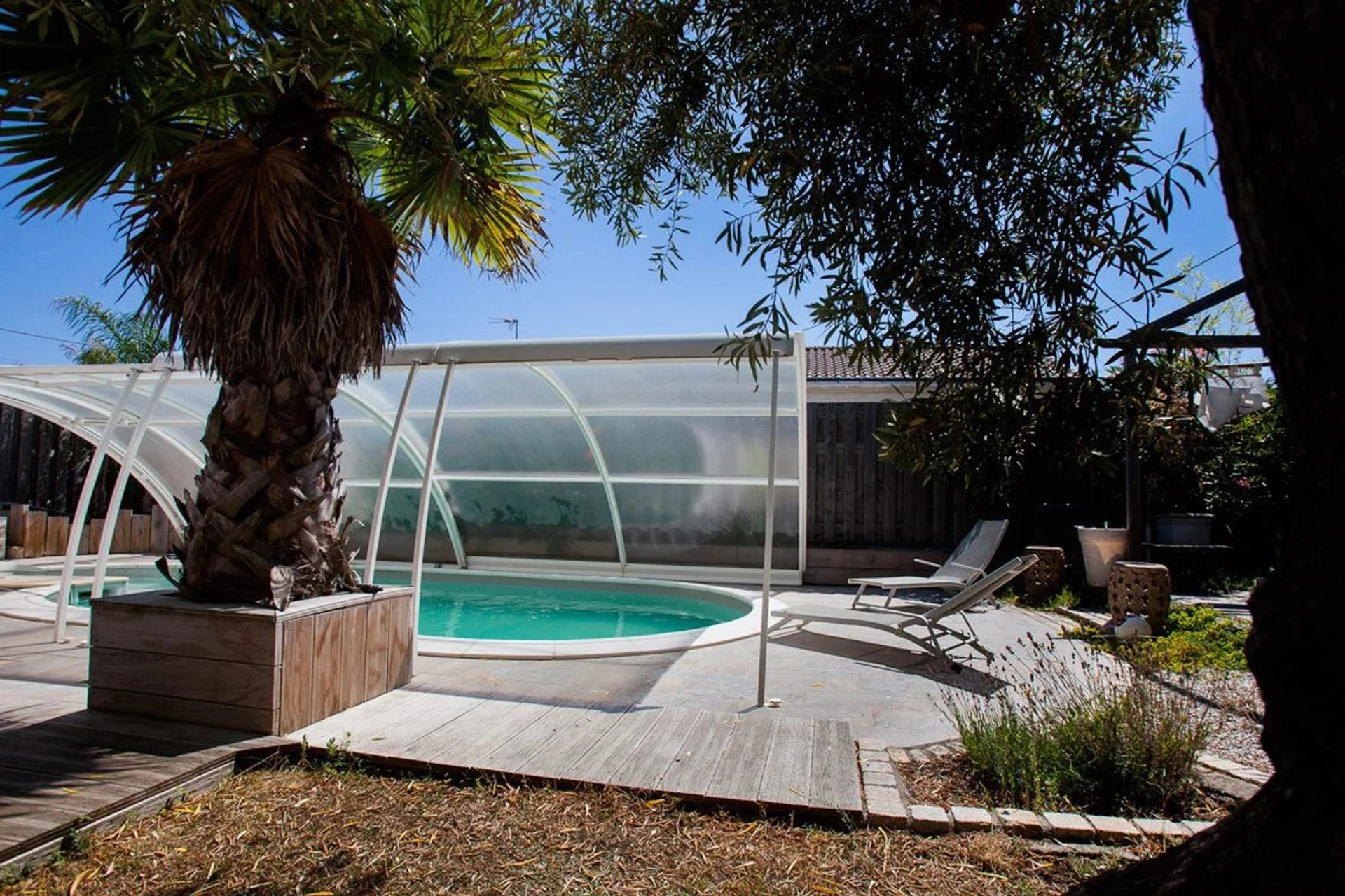 • Terrain clos de 840m², arboré de deux oliviers centenaires, avec coin potager, terrasse en bois plein Sud Ouest, cour gravillonnée, accès garage en béton désactivé , abri de jardin, et piscine chauffée de 24 m² avec terrasse dallée de 60m².