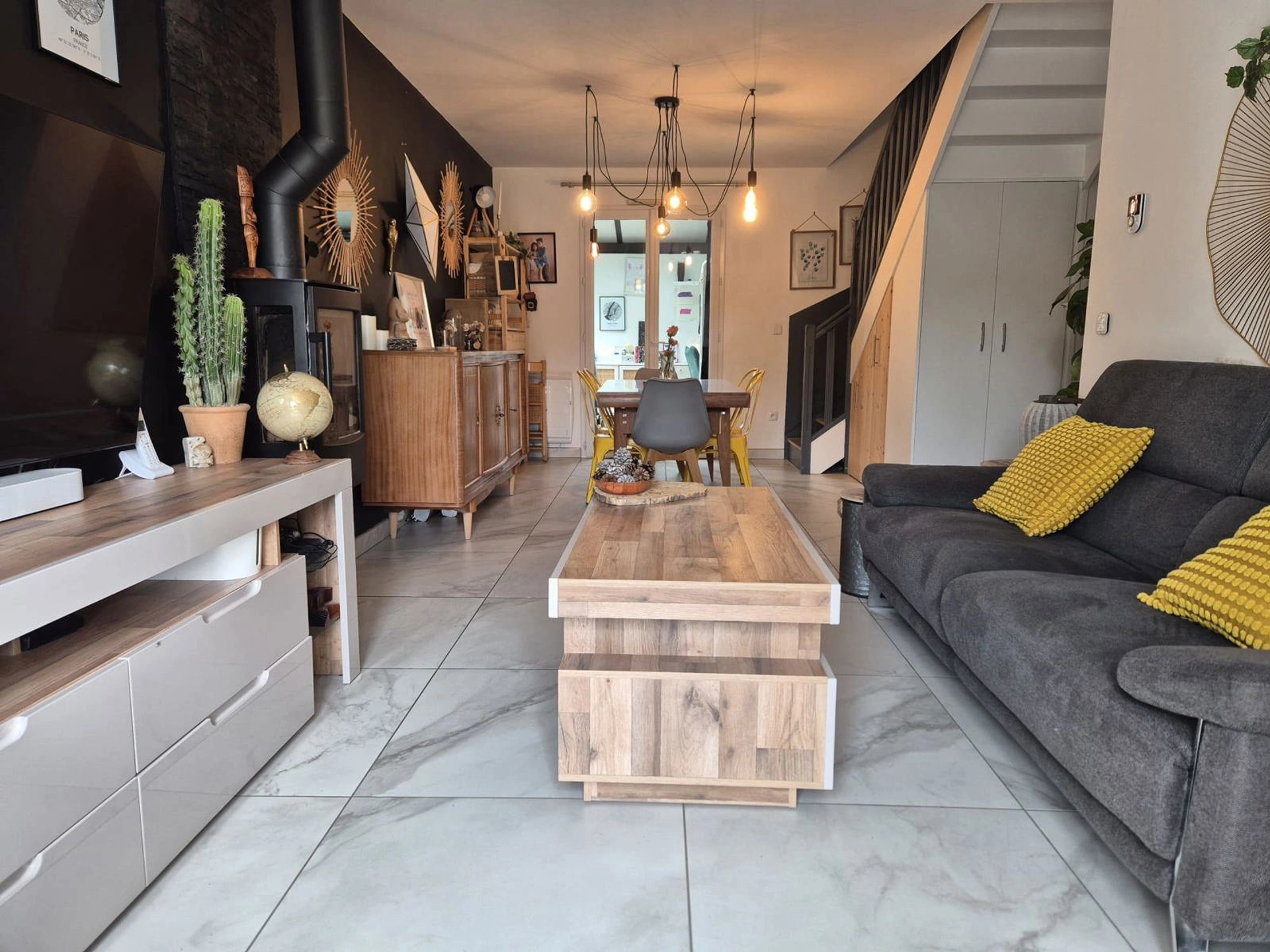 Dès l’entrée, vous découvrirez une belle pièce de vie lumineuse agrémentée d’un poêle à bois, parfaite pour des moments conviviaux. La cuisine semi-ouverte, entièrement équipée, s’intègre harmonieusement à cet espace. Le rez-de-chaussée propose également une pièce d’eau ainsi que trois chambres, permettant une véritable vie de plain-pied.