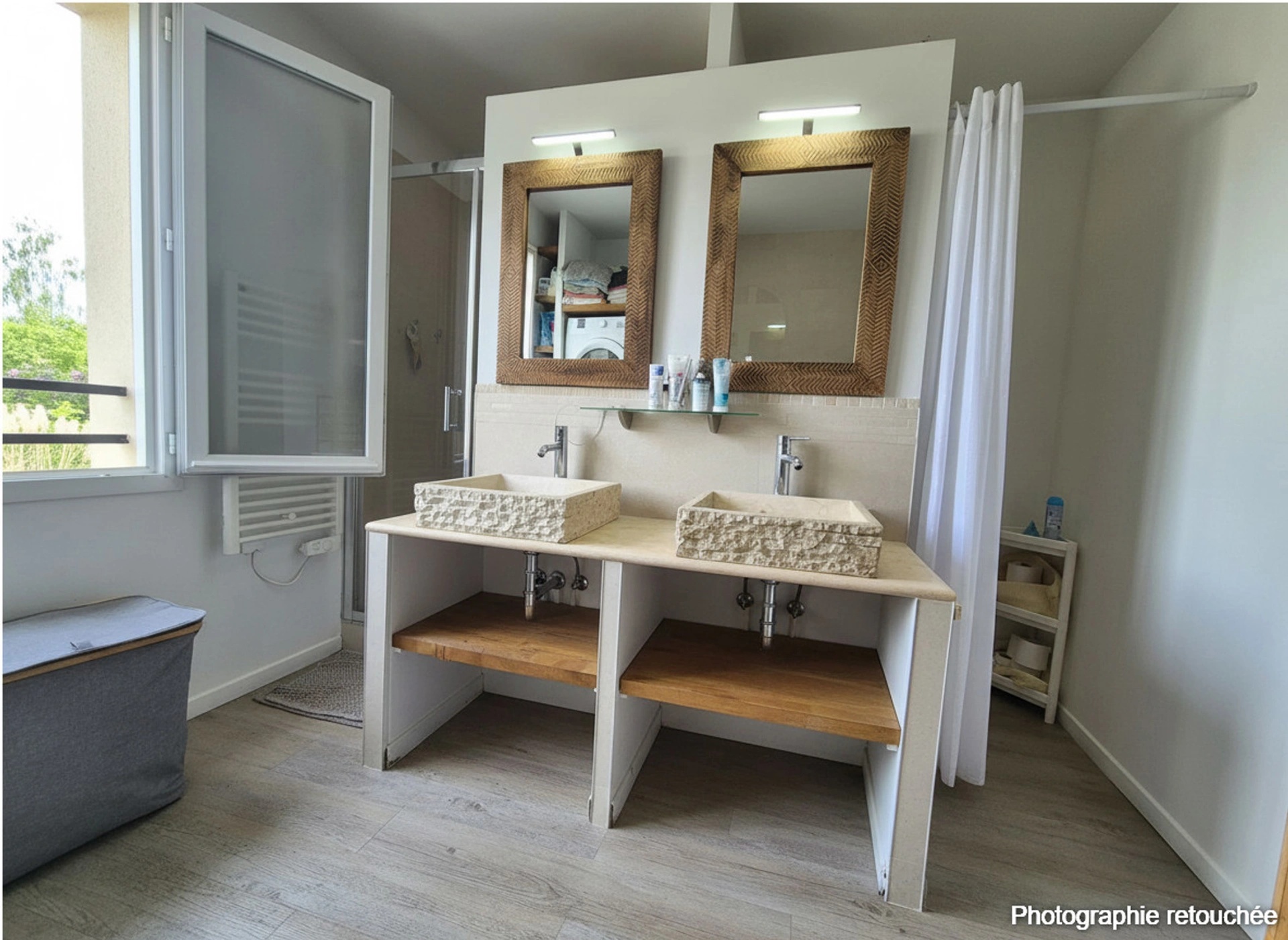 À l’étage, l’espace nuit se compose de trois chambres supplémentaires, dont une avec dressing, ainsi qu’une grande salle de bains équipée à la fois d’une douche et d’une baignoire.