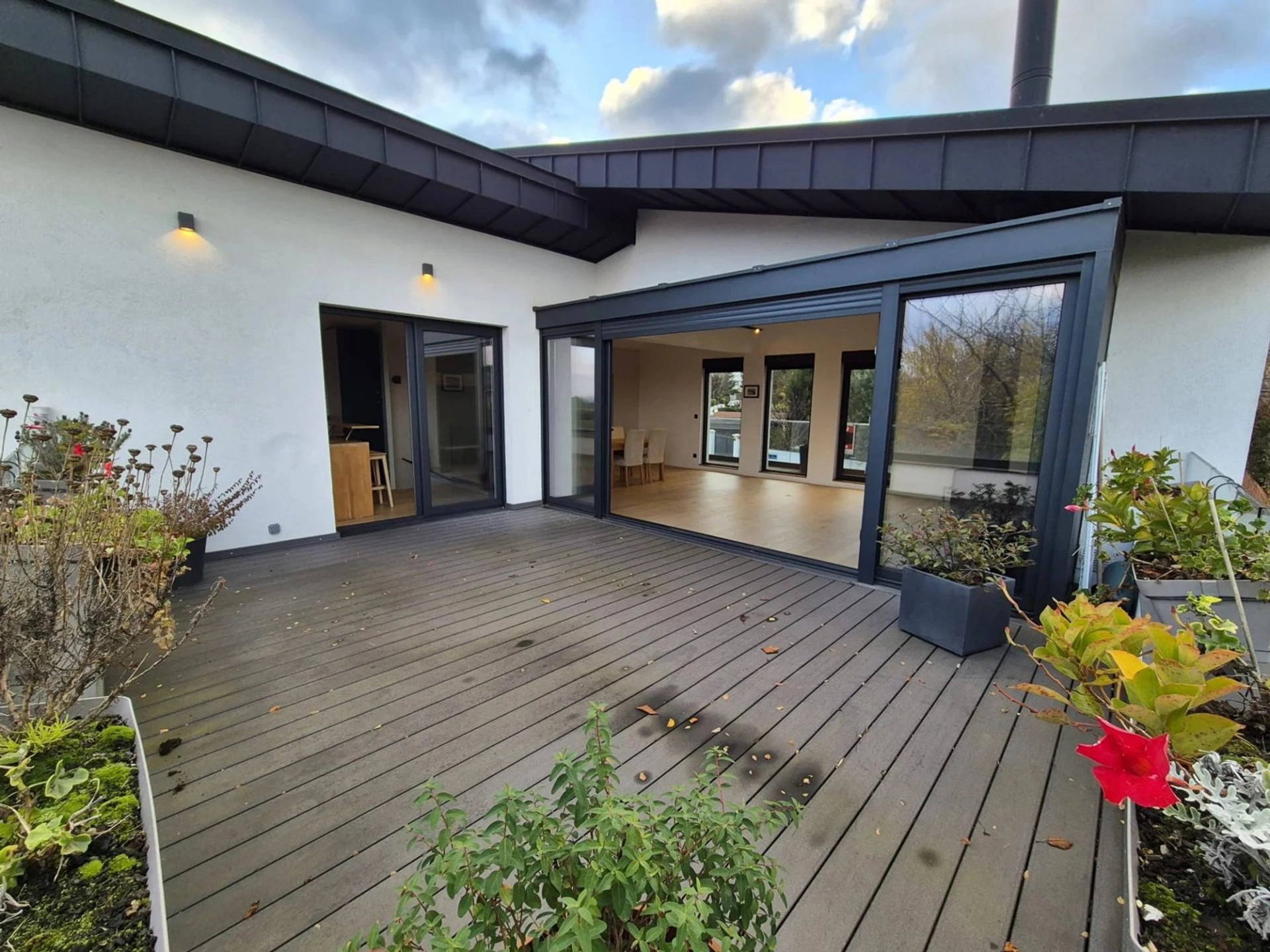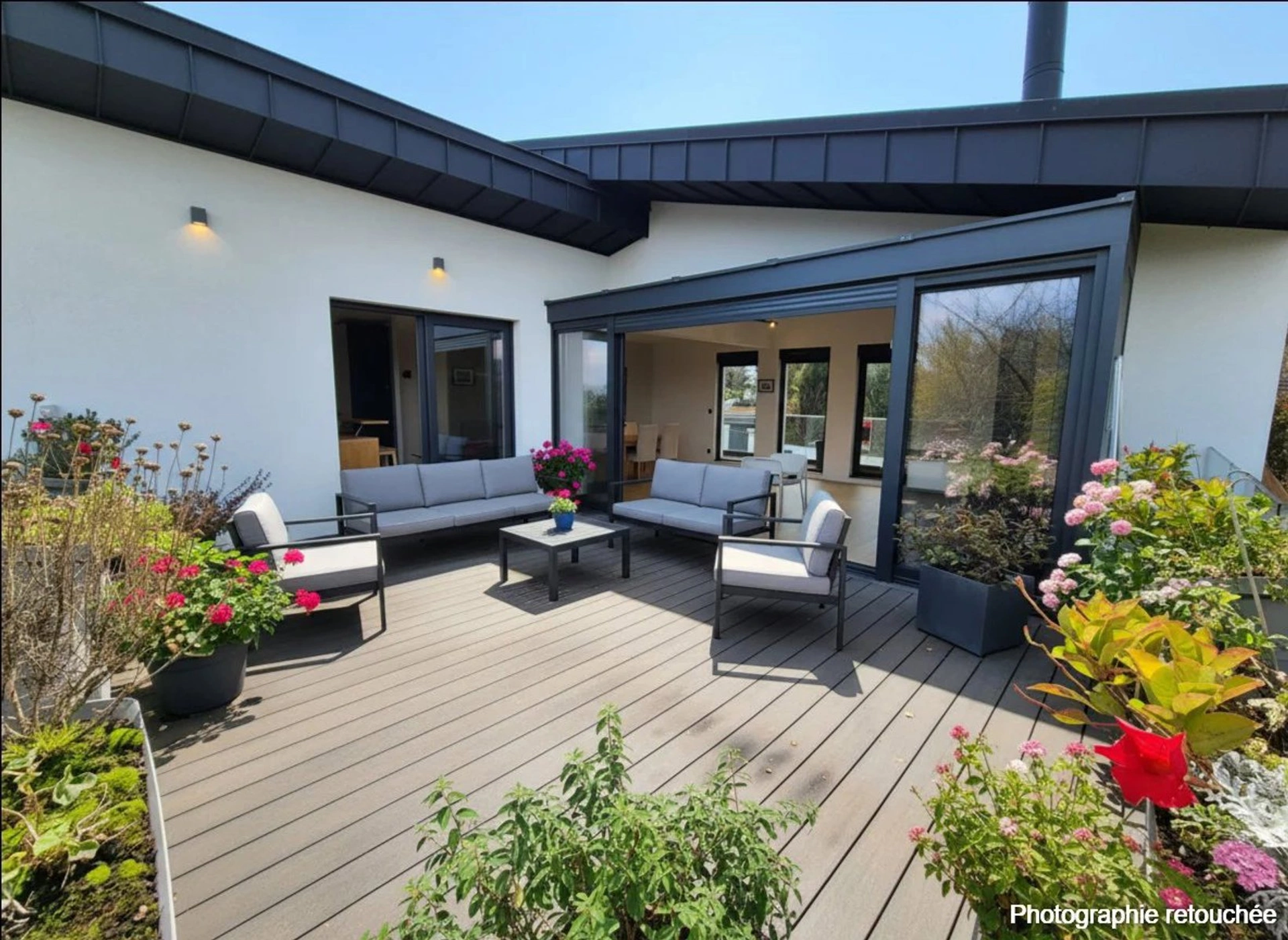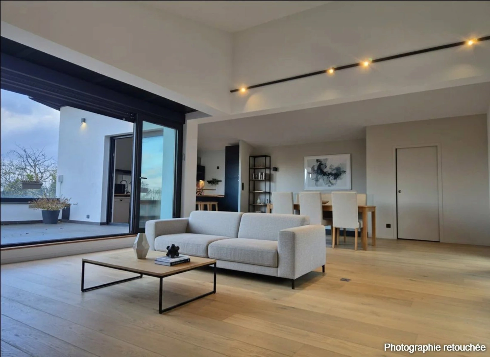 • Au 1er, une vaste pièce de vie cathédrale pouvant être ouverte sur une grande terrasse grâce à ses baies vitrées.