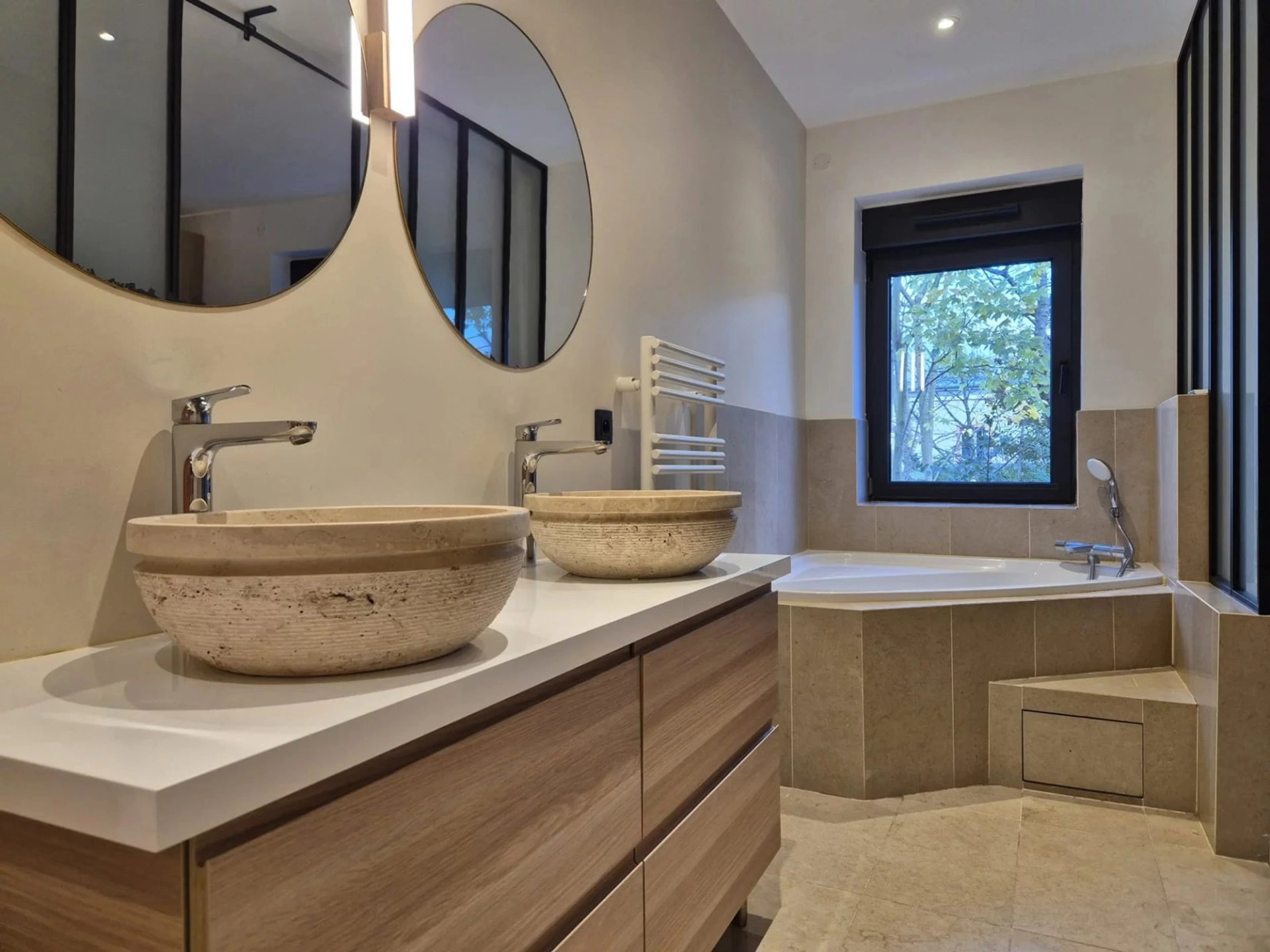 Parquets en bois massifs, carrelage et vasques en pierre naturelle.